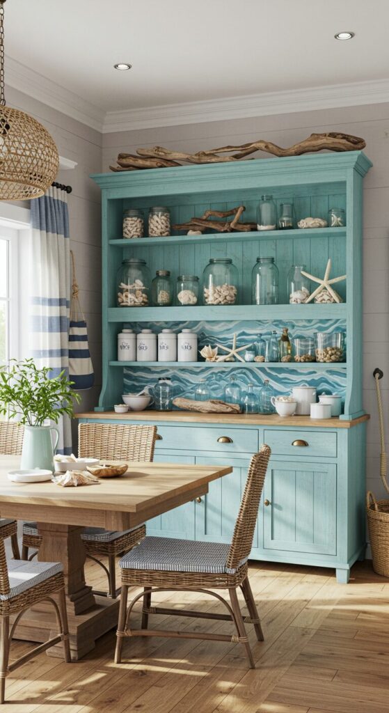 Waves of soft blue paint cover the walls, mirroring the hutch’s azure shelves lined with seashell accents.