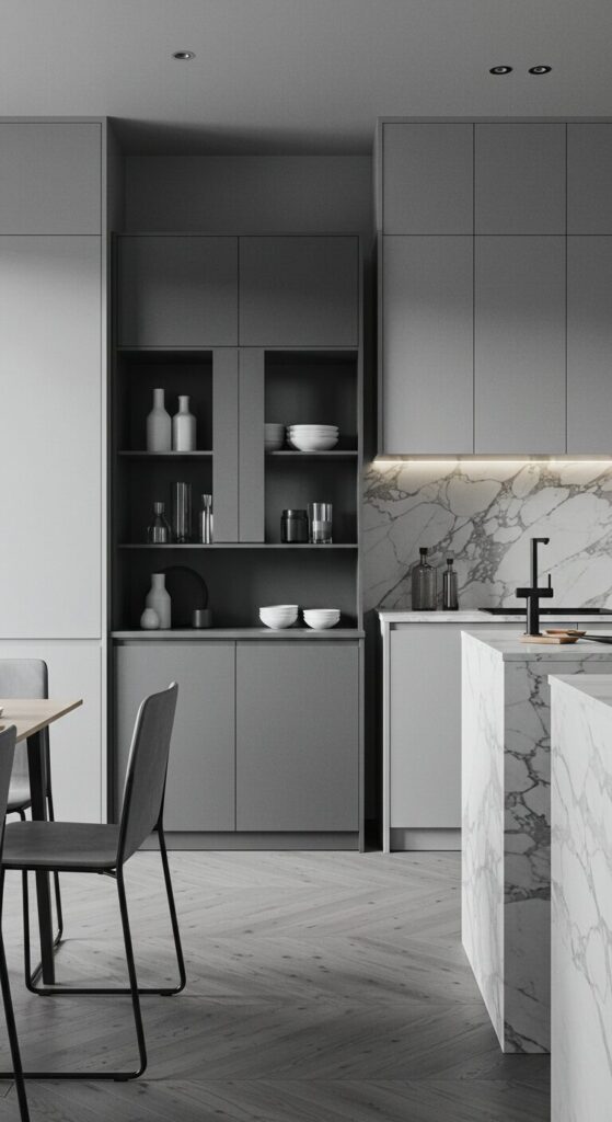Marble countertops gleam under recessed lights, emphasizing the room’s dominant cool gray palette.