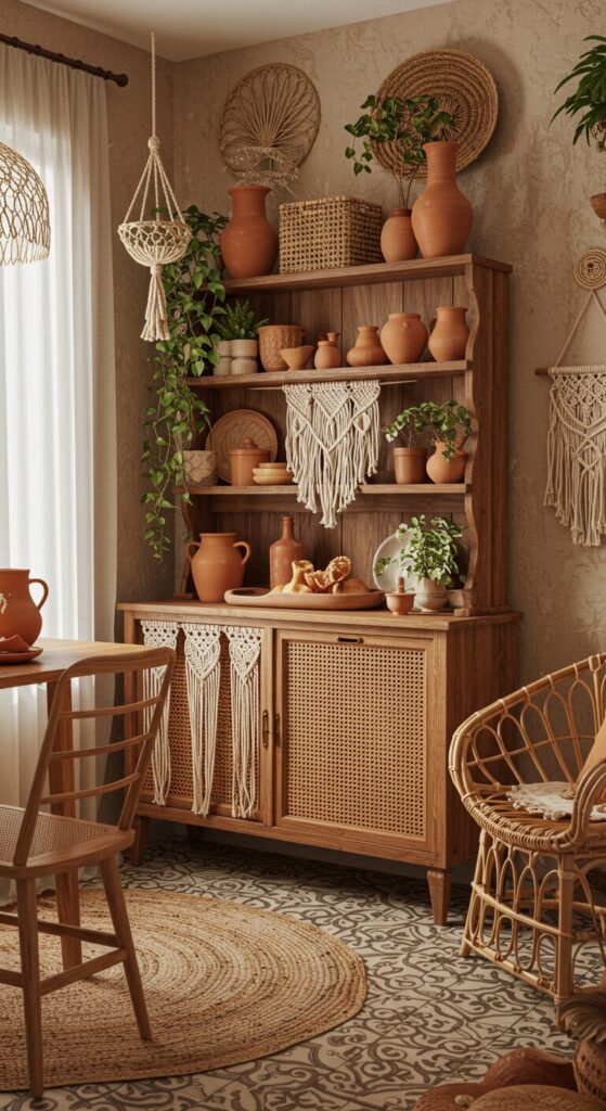 Layered macramé hangs from the ceiling, its neutral fringes complementing the hutch’s terracotta shelves.