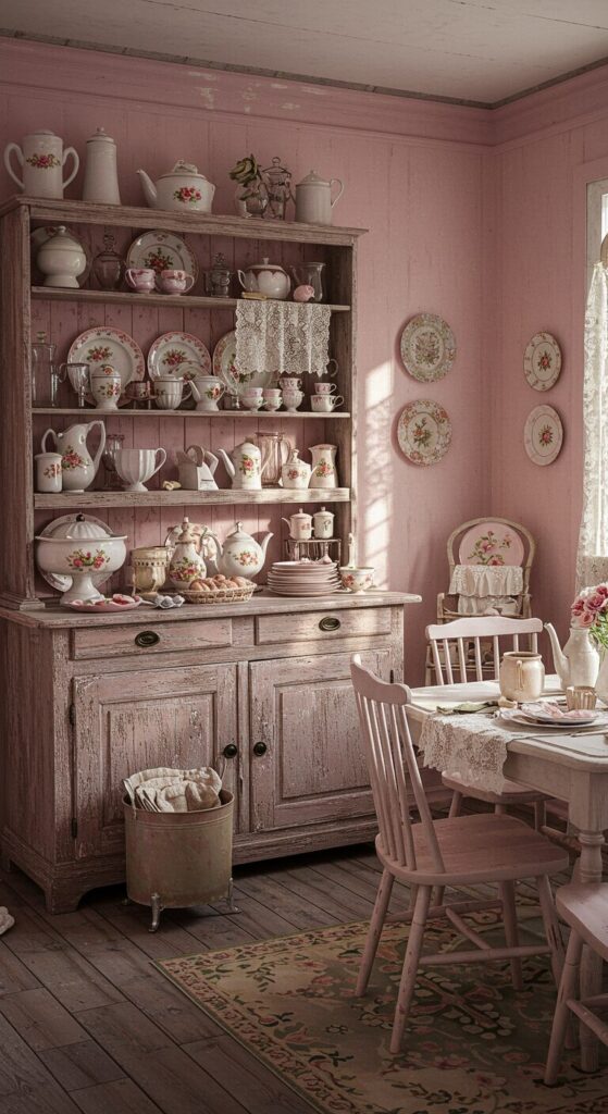 Soft pink hues wash over the walls, harmonizing with the hutch’s distressed rosewood frame and floral china.
