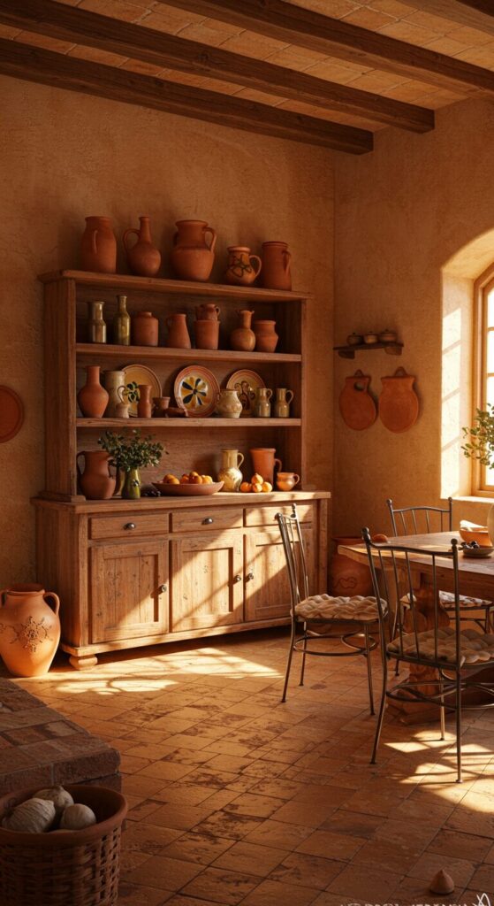 Terracotta tiles blanket the floor, their rich reds matching the hutch’s clay shelves and pottery displays.