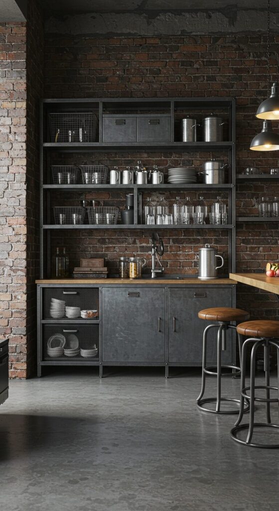 Exposed brick walls in charcoal frame the hutch’s steel shelves, echoing the room’s dominant industrial gray metals.
