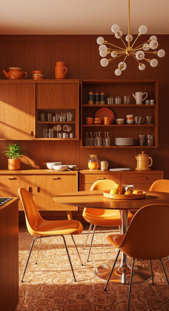 Eames-style chairs circle a tulip table, emphasizing the room’s dominant mid-century orange palette.