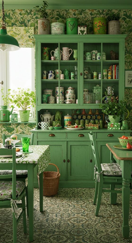 Lush green wallpapers bloom across walls, mirroring the hutch’s shelves filled with mismatched treasures.