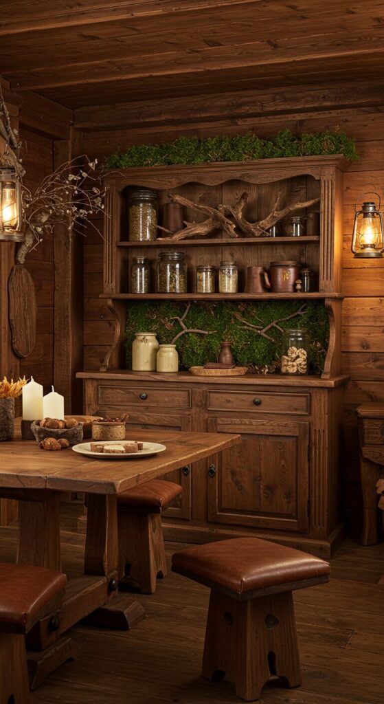 Soft lanterns glow amber, evoking forest cabins and hearty meals.