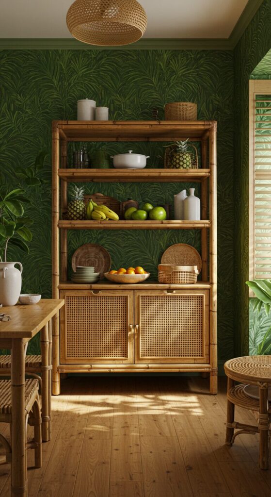 Palm fronds pattern the walls, their verdant hues dominating the hutch’s bamboo shelves with exotic fruits.