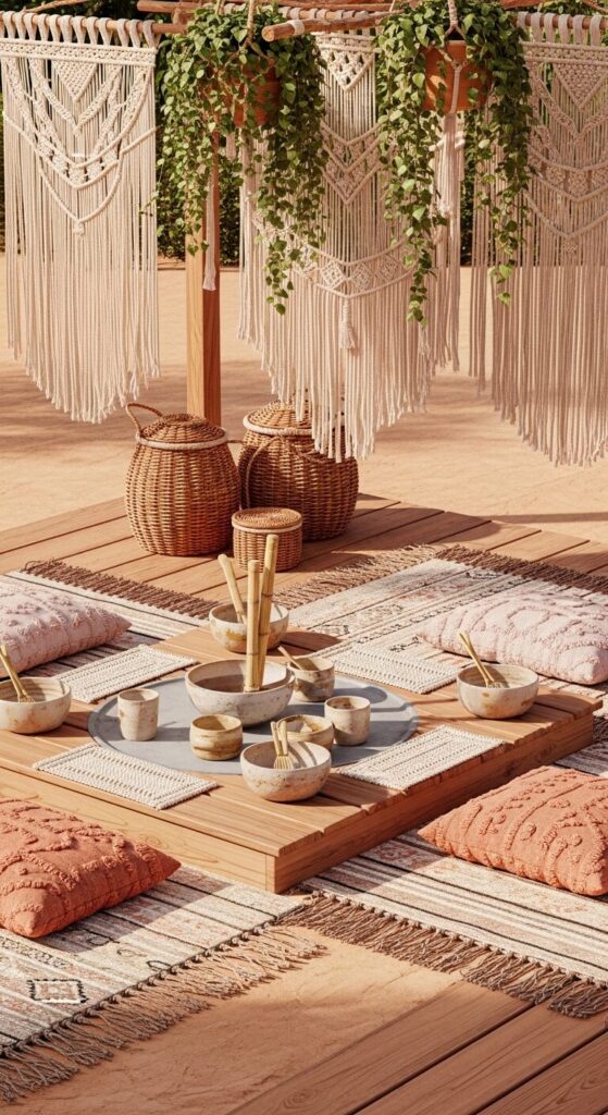 Woven reed mats add subtle texture, grounding the earthy tones with soft warmth.