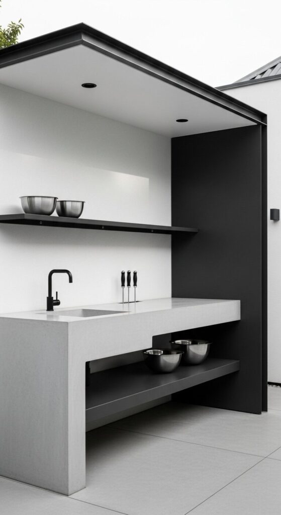 Clean lines define a gray mud kitchen in an open yard space, sleek and unadorned.