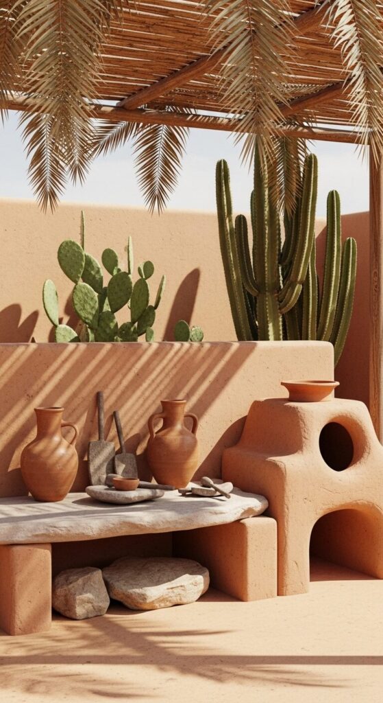 Sandy hues envelop a terracotta mud kitchen in a sun-drenched yard corner.