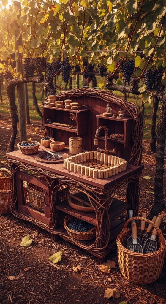 Cork shelves display grape clusters and utensils, with a woven sink and earthy pots.