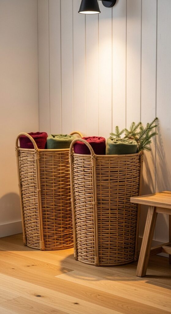 Envision a rustic entryway where tall rattan baskets in honey-toned weaves stand against a white shiplap wall, overflowing with rolled-up knit blankets in deep burgundies and forest greens.