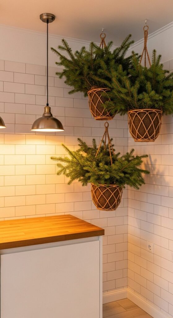 Picture a bright kitchen nook where woven rattan plant holders in earthy browns suspend faux evergreens, their green needles popping against white subway tiles and warm amber lighting.