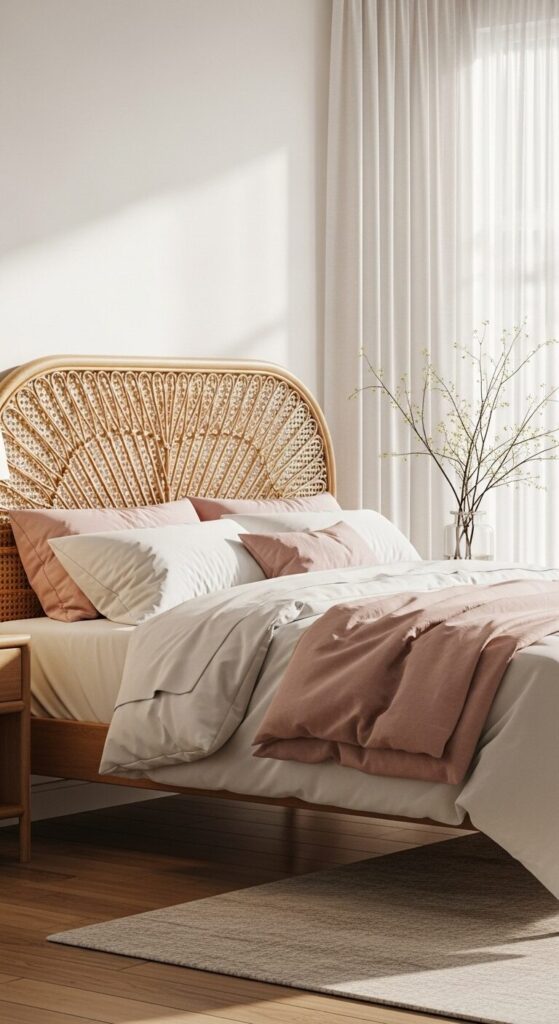 Visualize a serene master bedroom where a curved rattan headboard in light caramel tones anchors a bed piled with fluffy duvets in soft whites and pale pinks.