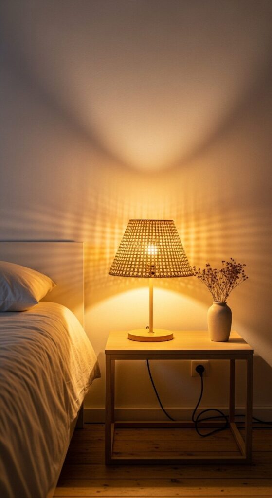 Imagine a dimly lit bedroom where rattan lamp shades in natural tan hues diffuse warm yellow light, casting intricate woven shadows on cream-colored walls.