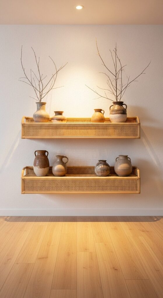 Think of floating rattan shelves on a living room wall, their curved edges in pale tan displaying ceramic vases with bare branches against a soft white background.