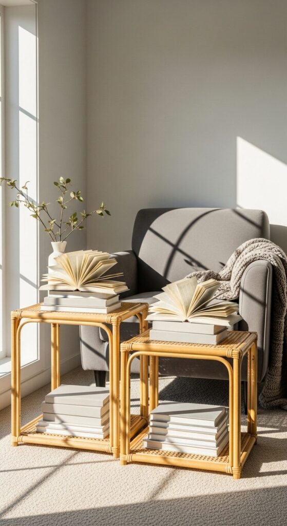 Visualize a reading alcove where slim rattan side tables in warm honey shades hold stacks of neutral-covered books, illuminated by natural daylight and complemented by soft grays and beiges for a calm, introspective winter nook.