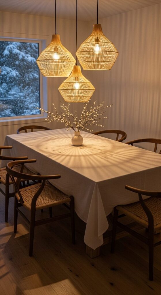 Envision a dining area illuminated by clustered rattan pendant lights in golden tones, casting patterned shadows on a wooden table set with neutral linens in soft grays and whites, fostering a gatherings-ready, ambient winter glow.