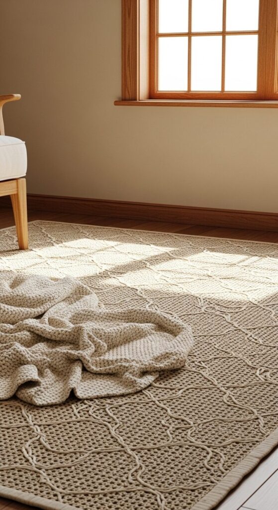 Picture a cozy den where a large rattan rug in natural light weaves covers the floor, layered under a plush throw in earthy browns and creams, with sunlight streaming in to emphasize its textured pattern and inviting barefoot comfort.