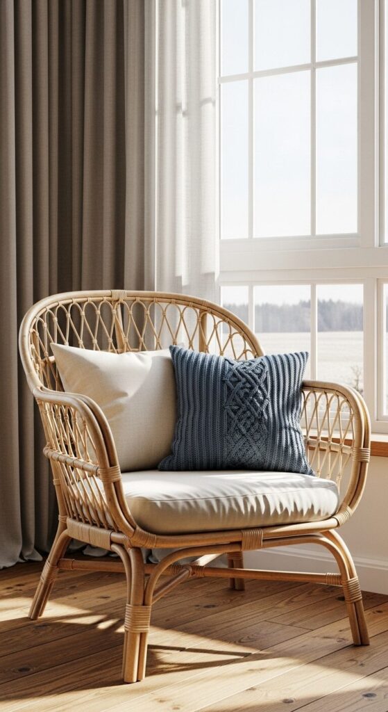 Imagine a window-side spot where a rattan armchair in warm beige weave cradles oversized knit pillows in ivory and light blues, with afternoon sun warming the scene against pale walls for a dreamy, restorative escape.