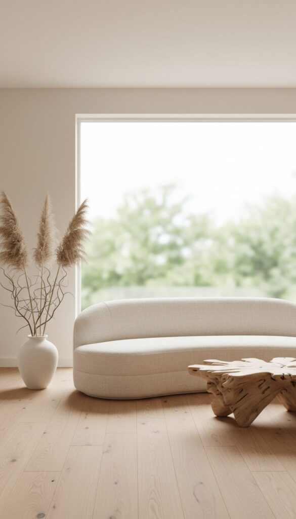 Combine the clean aesthetic of minimalism with the comforting elements of organic design. This living room focuses on natural materials and fluid forms within a strictly neutral palette of whites, creams, and light woods.