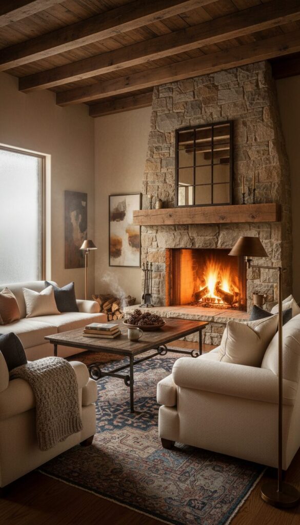 Combine the rugged charm of rustic aesthetics with sophisticated neutral tones for a truly elegant winter living room.