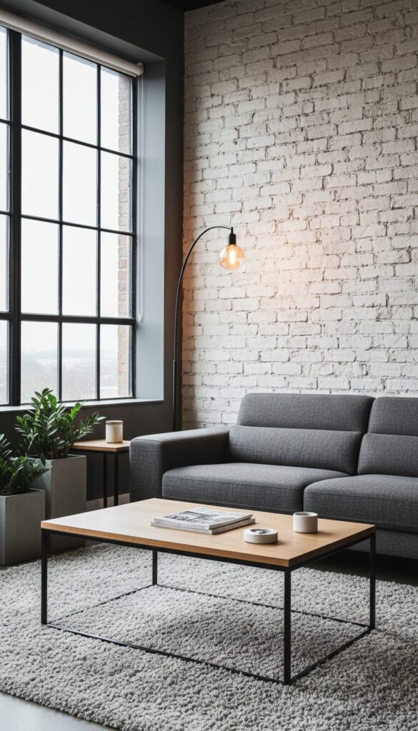 Infuse your neutral living room with a touch of urban edge through subtle industrial chic elements. This design pairs warm neutrals with raw materials like exposed brick (painted white or light grey), black metal accents, or concrete finishes.