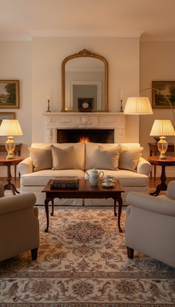 Symmetry often plays a role, with matching armchairs and balanced decor. Rich wood accents, sophisticated lighting fixtures, and a carefully chosen muted color scheme of deep creams, taupes, and soft greys create a living room that is both grand and intimately comfortable, a true haven for any season.