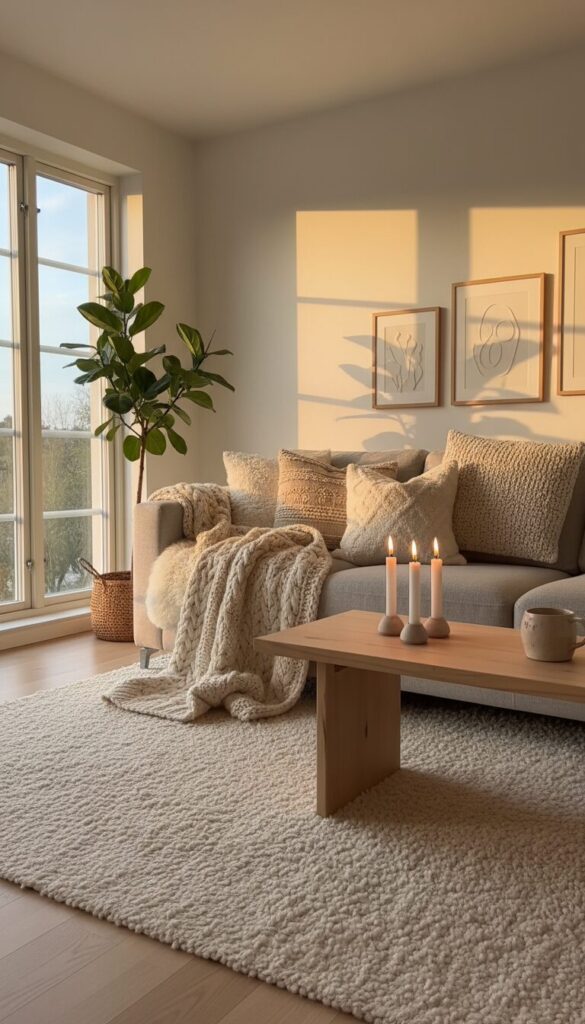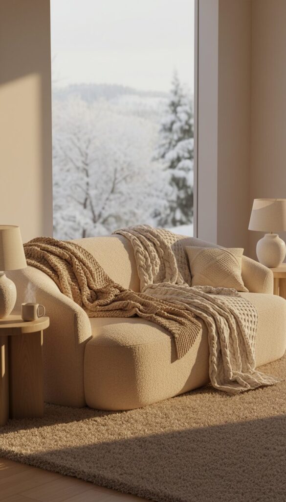 Textural variations are key, with elements like faux fur throws, chunky knit blankets, and woven linen upholstery adding depth and warmth.