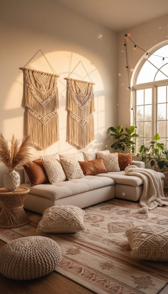 This design incorporates natural fibers like macrame, rattan, and woven textures in shades of cream, beige, and terracotta.