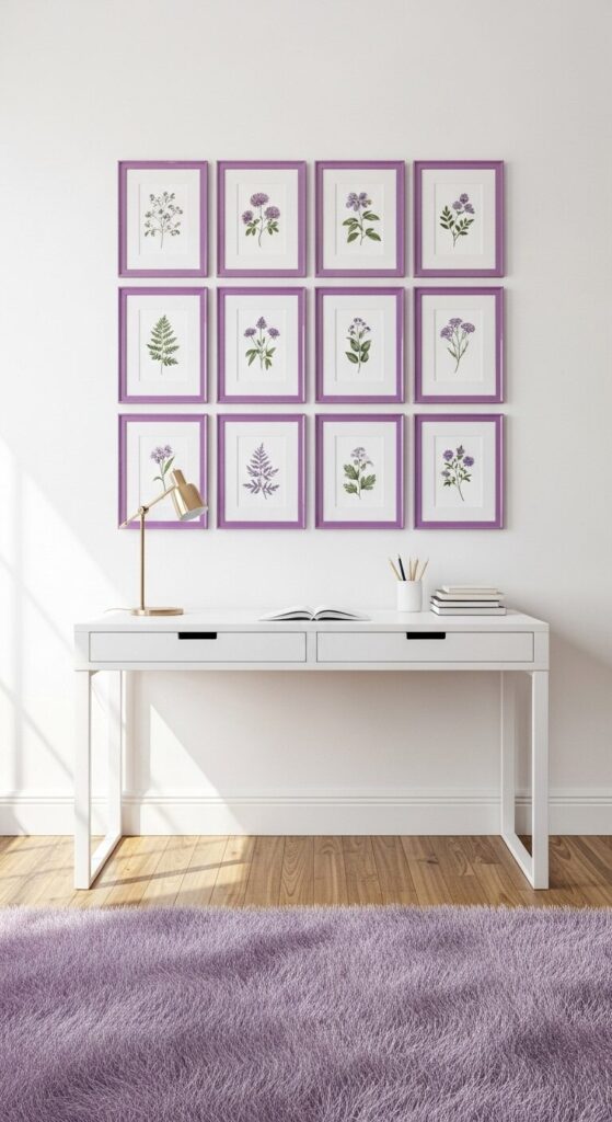 Nine framed botanical prints in white mats float above a sleek white desk, their lilac-painted frames echoing a fuzzy lavender rug underfoot. Soft daylight bounces off glossy frames, lifting the entire nook.