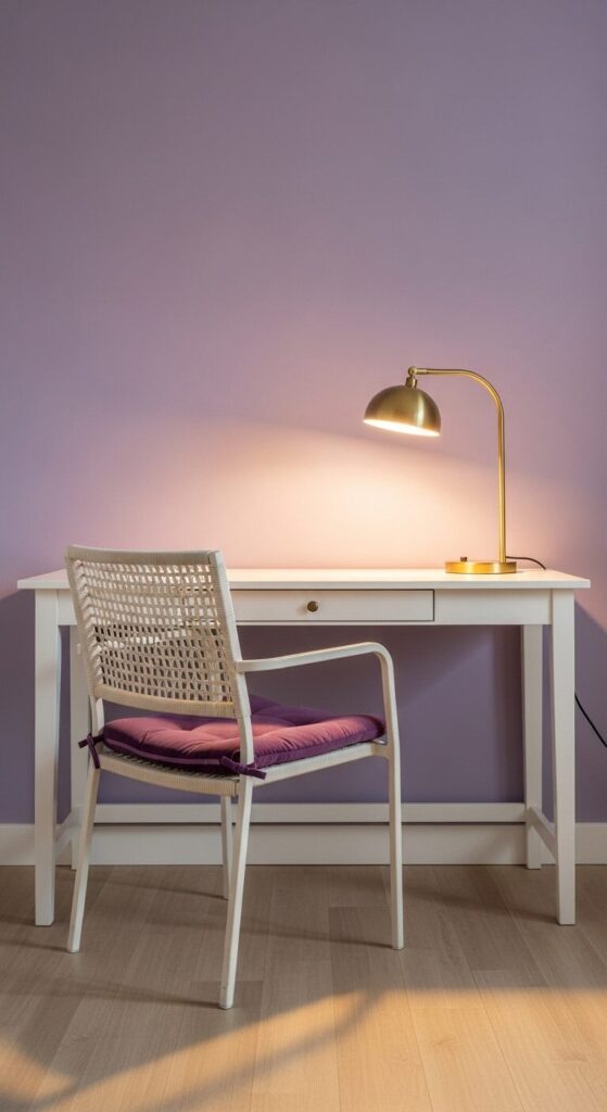 A matte lavender accent wall absorbs golden afternoon light, paired with a creamy white desk and brushed-brass lamp that casts gentle pools of warmth. Plush amethyst velvet cushions top a woven chair, creating a cocoon of quiet luxury.