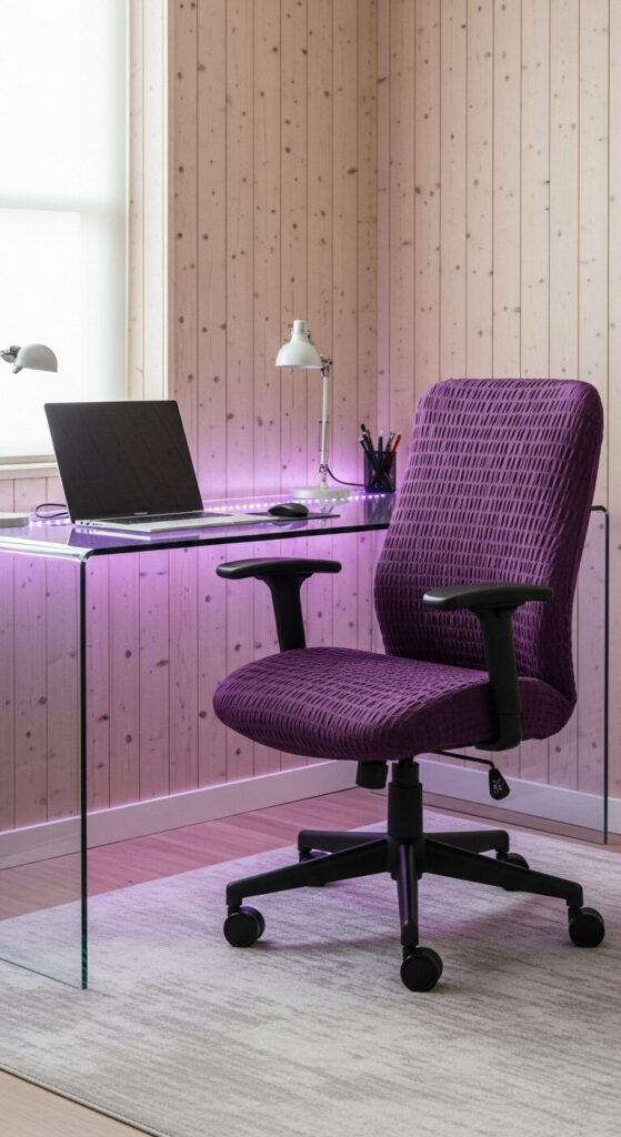 A sleek ergonomic chair wears a custom amethyst slipcover, tucked under a glass-top desk reflecting soft purple LED strips hidden beneath. Pale wood walls keep the mood airy and open.