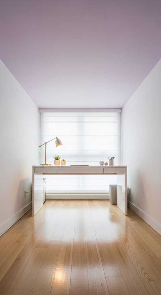 The ceiling painted pale lilac draws the eye upward, making a small room feel taller while a white lacquer desk reflects the unexpected color. Sheer blinds keep it subtle.