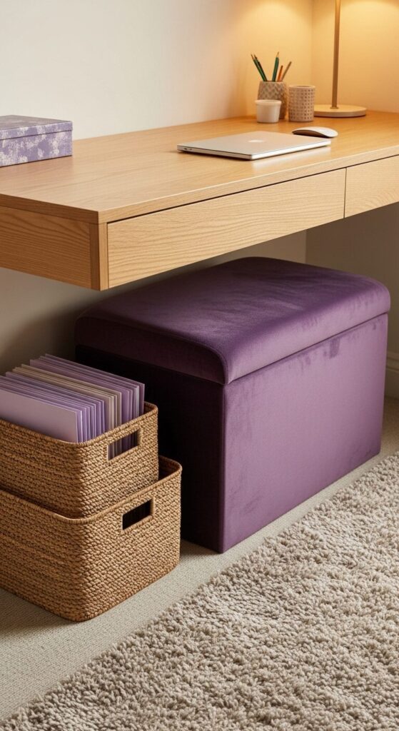 A low eggplant velvet ottoman doubles as footrest and hidden storage, pushed under a floating oak desk flanked by lavender file folders in woven baskets. Soft rug fibers peek beneath.