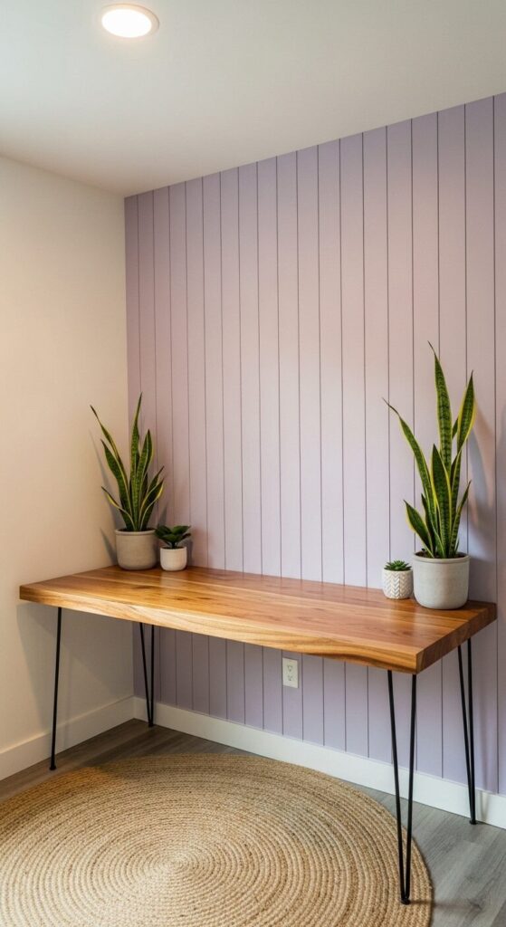 Vertical shiplap painted soft lavender climbs one wall behind a floating shelf desk, contrasted by matte black metal legs and a jute rug. Potted snake plants add life.