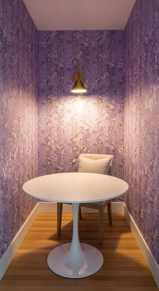 A compact alcove blooms with removable wisteria wallpaper in lavender tones, framing a round white table and cushioned chair. Brass wall sconce adds evening glow.
