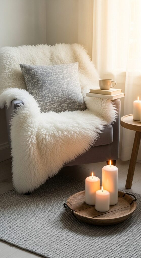 Envision a cozy corner with a plush armchair draped in a shearling throw. A cluster of white pillar candles flickers on a wooden tray, casting a soft, inviting glow. The vibe is pure relaxation.