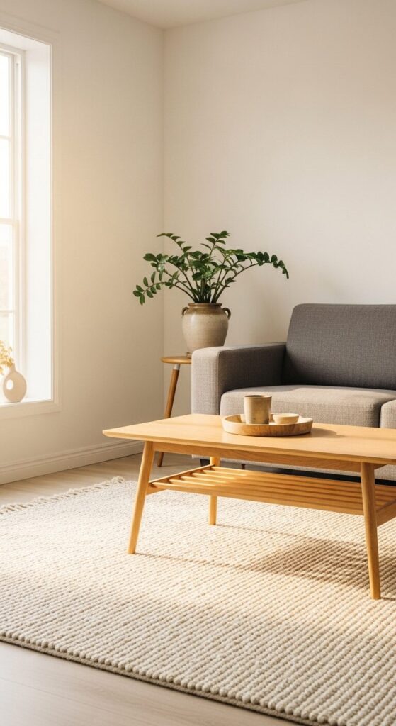 Imagine a living room anchored by a plush wool rug in soft ivory or taupe. The rug’s texture contrasts with sleek wooden furniture, creating a cozy yet modern vibe. A single green plant adds life.