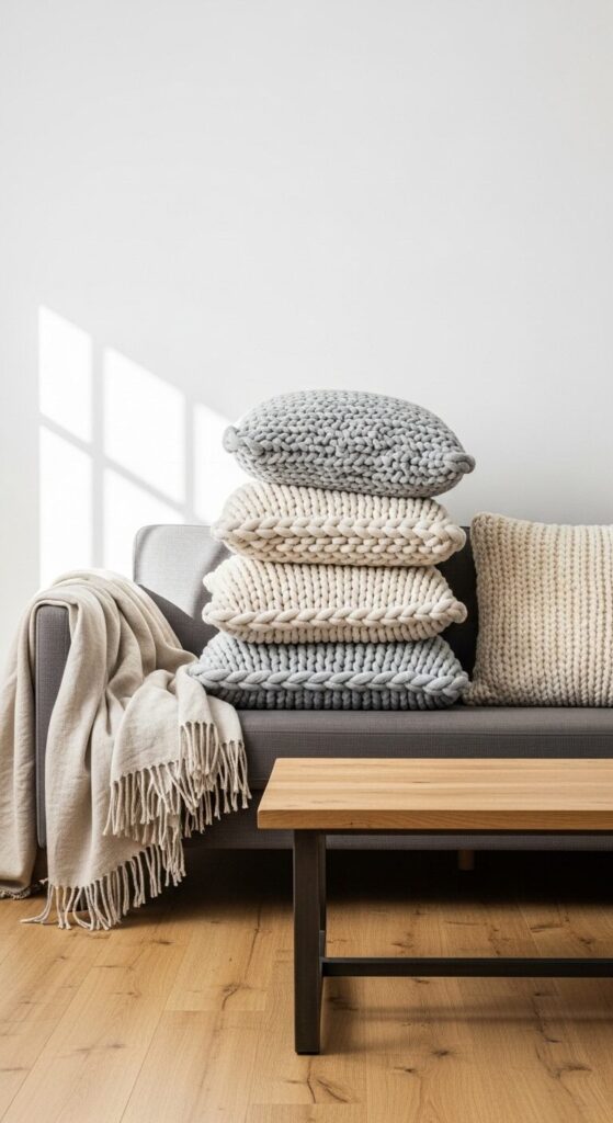 Picture a sofa piled with chunky knit pillows in creamy whites and soft grays. The tactile cushions invite you to sink in, while wooden accents keep the look grounded. The vibe is effortlessly cozy.