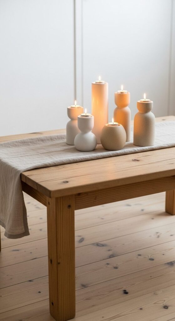 How to Achieve This Look: Arrange holders in a loose triangle for balance. Add a runner in neutral tones for elegance.