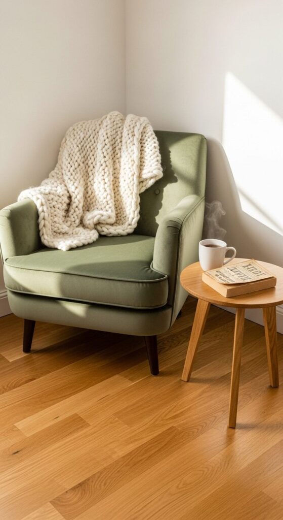 Envision a reading nook with a plush velvet armchair in soft sage green, paired with a wooden side table. A wool throw drapes over the arm, inviting cozy moments. The vibe is luxurious yet simple.