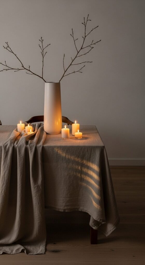 Imagine a dining table with a single bare branch in a tall ceramic vase, its stark lines softened by a linen tablecloth. The minimalist setup feels wintry yet elegant. Candlelight enhances the mood.