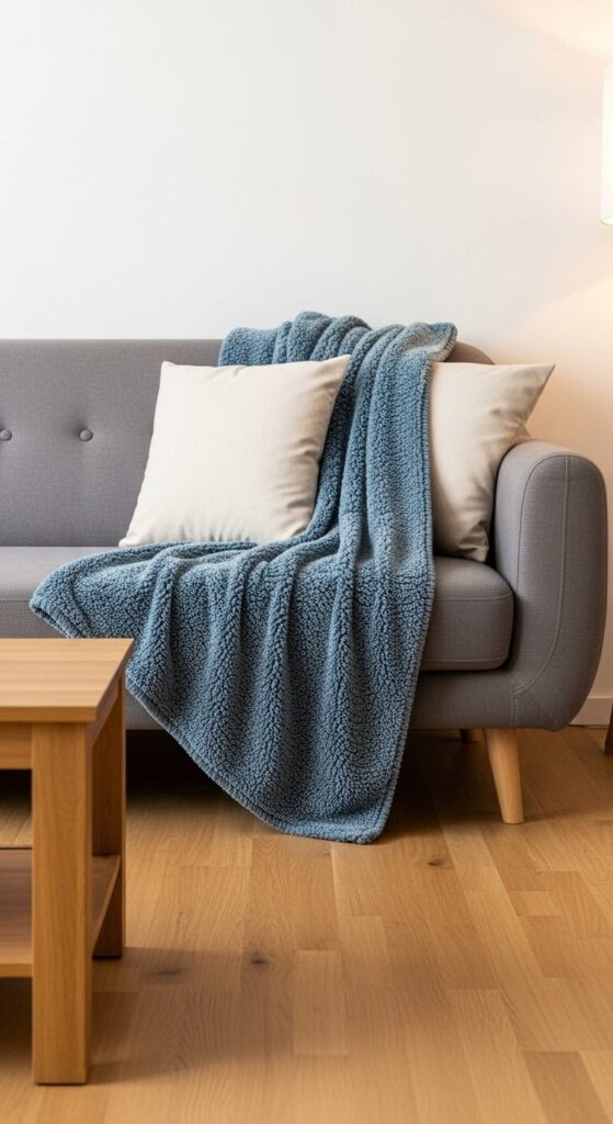 Imagine a sofa draped with a frosty blue throw blanket, its cool hue popping against creamy cushions. The soft fabric invites you to snuggle up, while wooden accents keep the look grounded. The vibe is fresh yet cozy.