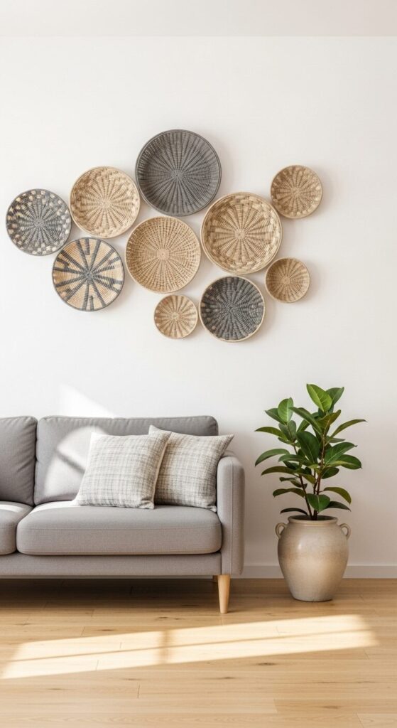 Picture a living room wall adorned with a cluster of woven baskets in neutral tones. Their organic textures contrast with crisp white walls, adding warmth and character. The look is understated yet striking.