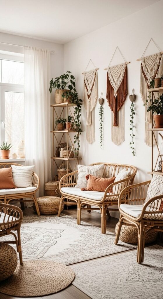 Creamy cotton threads mix with wooden beads, alongside rattan chairs and jute rugs filling the room.