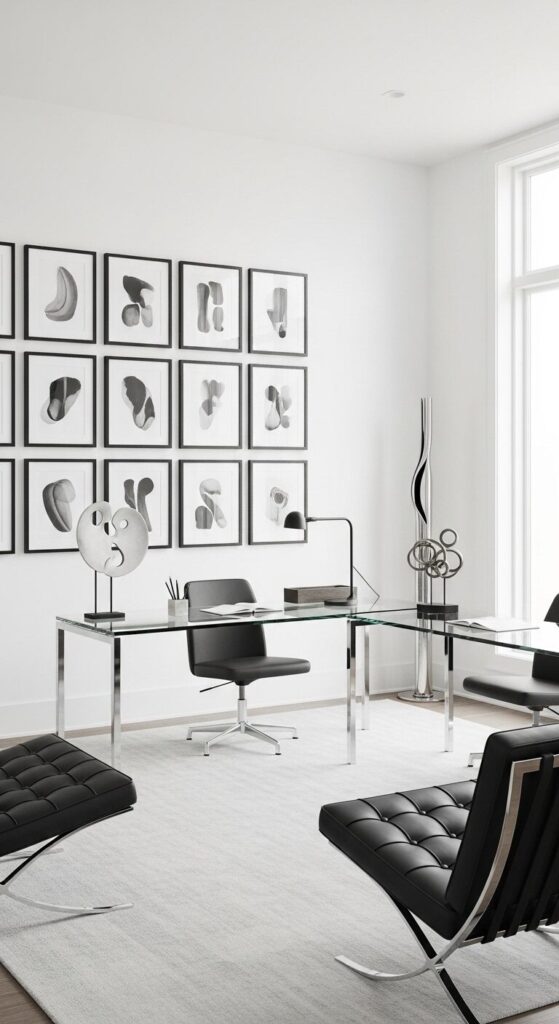 Choose uniform frames and space them evenly for a gallery that sharpens your daily routine.