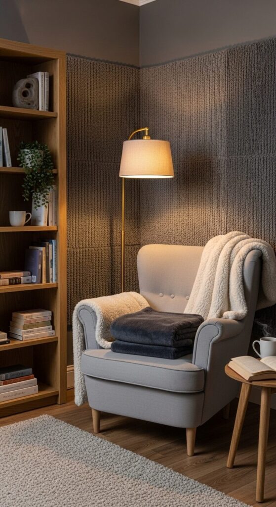 Woolen throws and cushioned seats nestle in this muted, inviting haven.