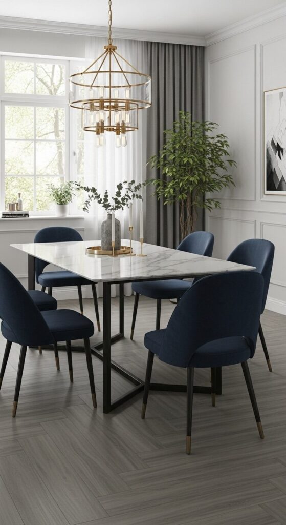 Imagine a chic dining room with cool gray herringbone vinyl flooring, reflecting soft chandelier light. The geometric pattern adds sophistication, paired with velvet navy chairs and a marble tabletop.