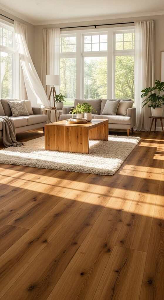 Picture a cozy living room bathed in soft morning light, with warm, honey-toned vinyl planks mimicking weathered oak. The rich grain patterns add rustic charm, while plush cream rugs and linen curtains enhance the inviting vibe.