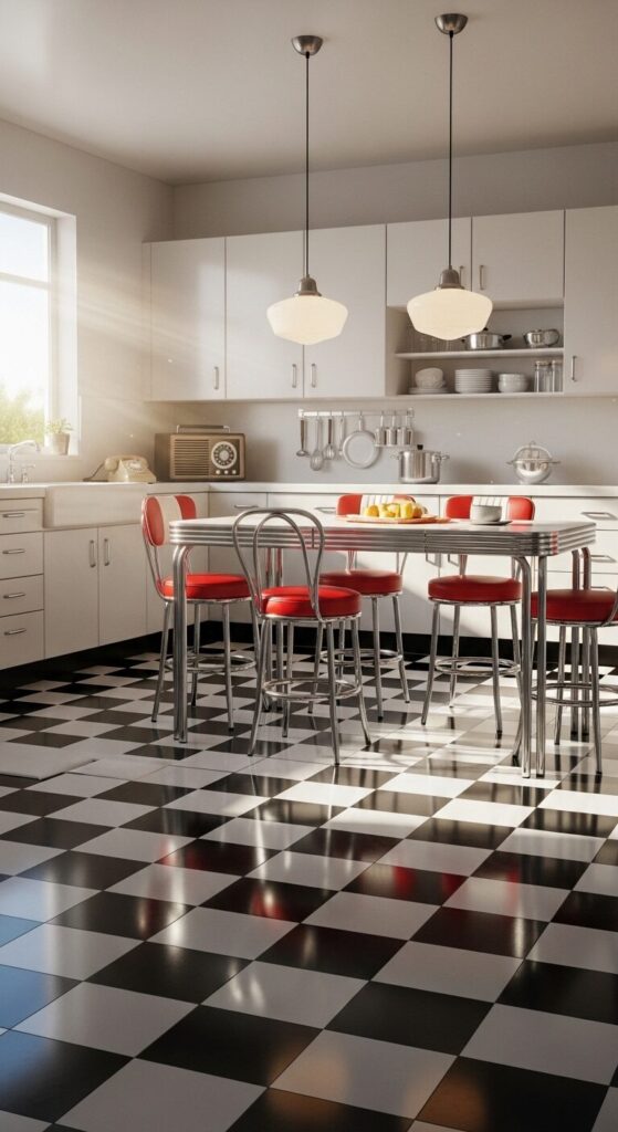 Step into a retro-inspired kitchen with bold black-and-white checkered vinyl flooring. Paired with red bar stools and chrome appliances, it’s a nostalgic diner vibe.